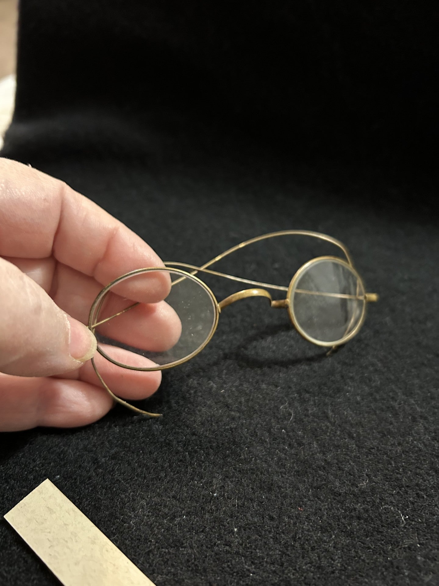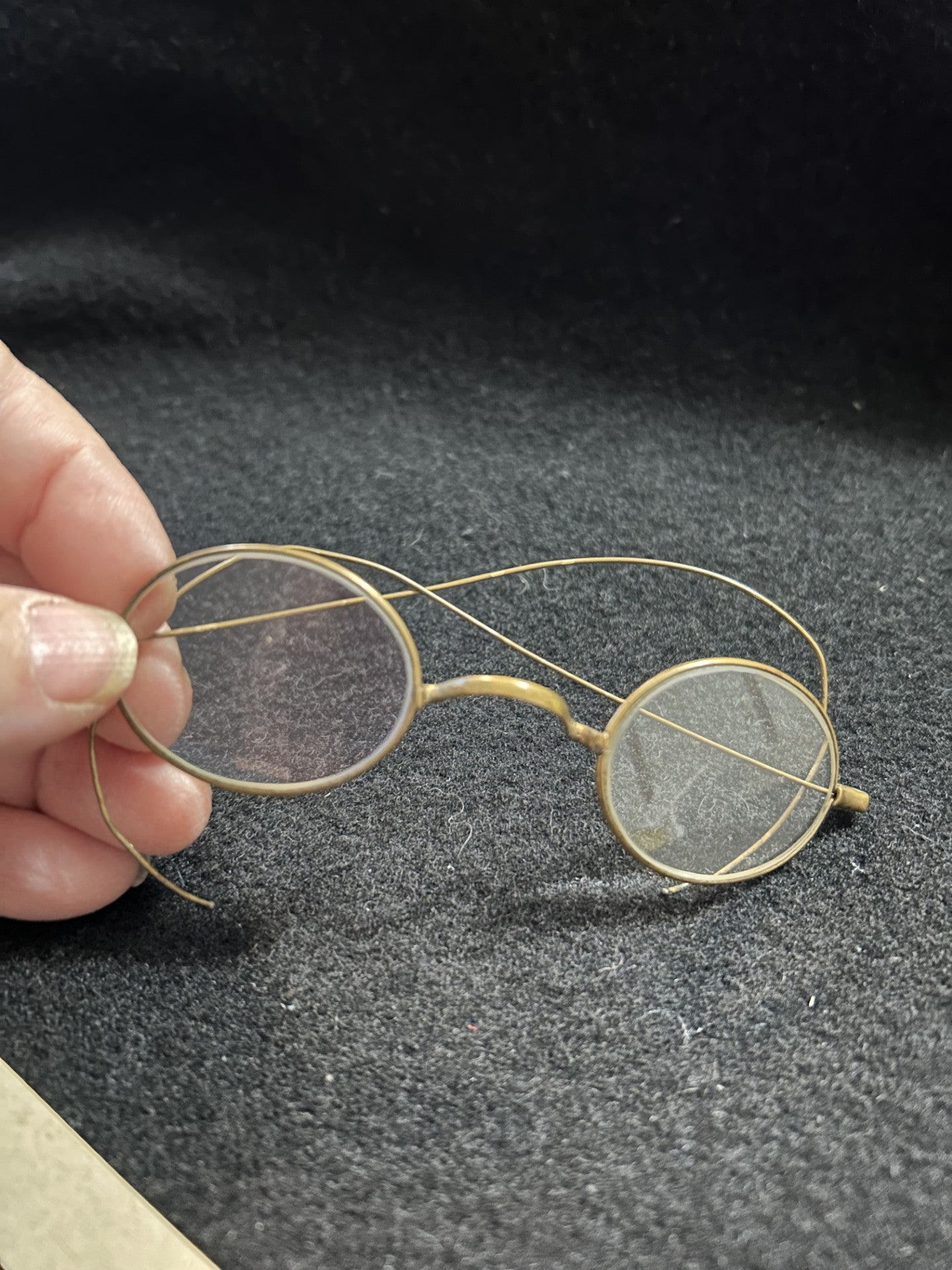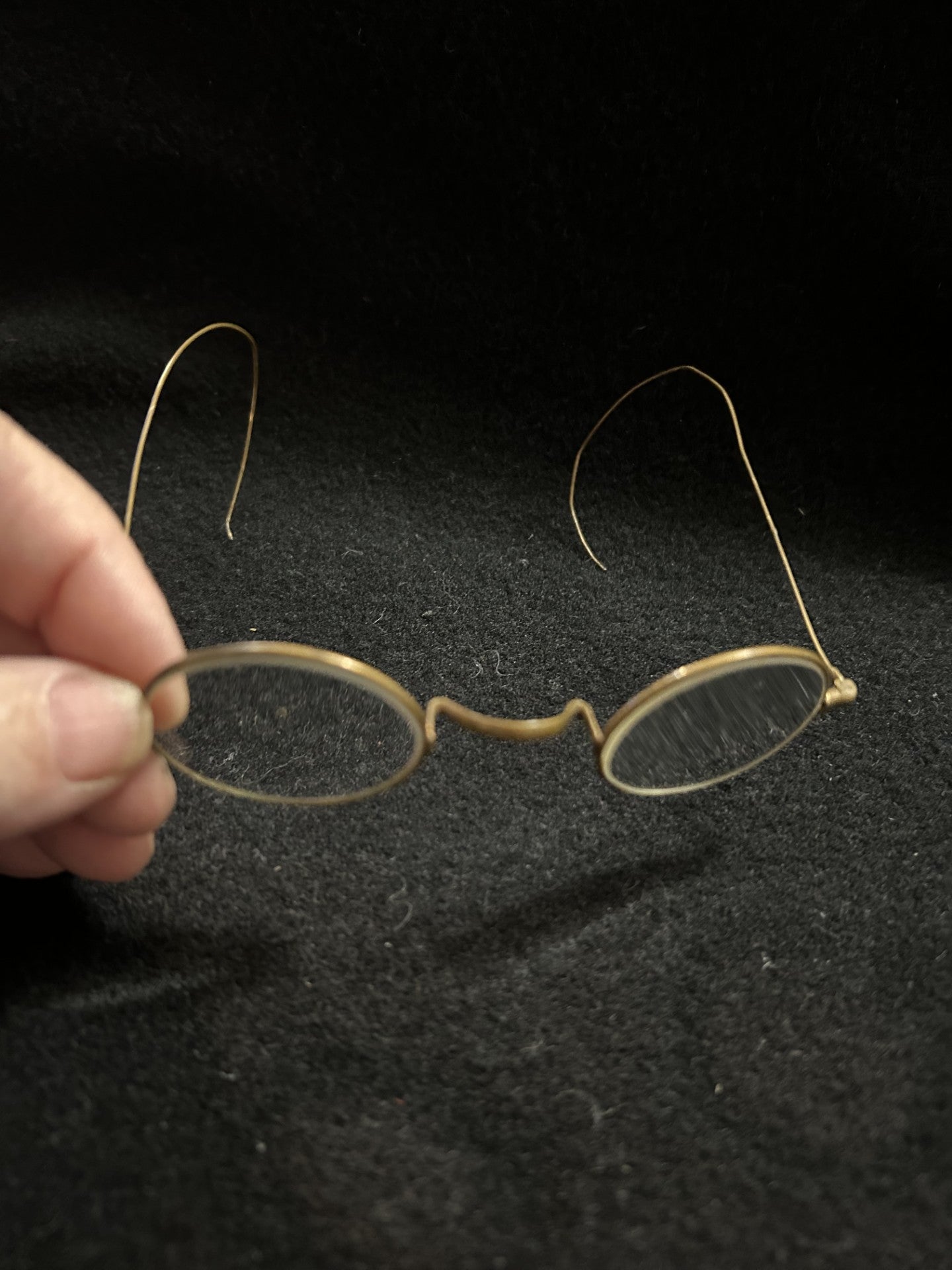 This listing is for a pair of old wire framed glasses, with a brass finish, with little finish loss, other than on the bows.  They are in exceptional condition for their age.  These do not come with a case.
