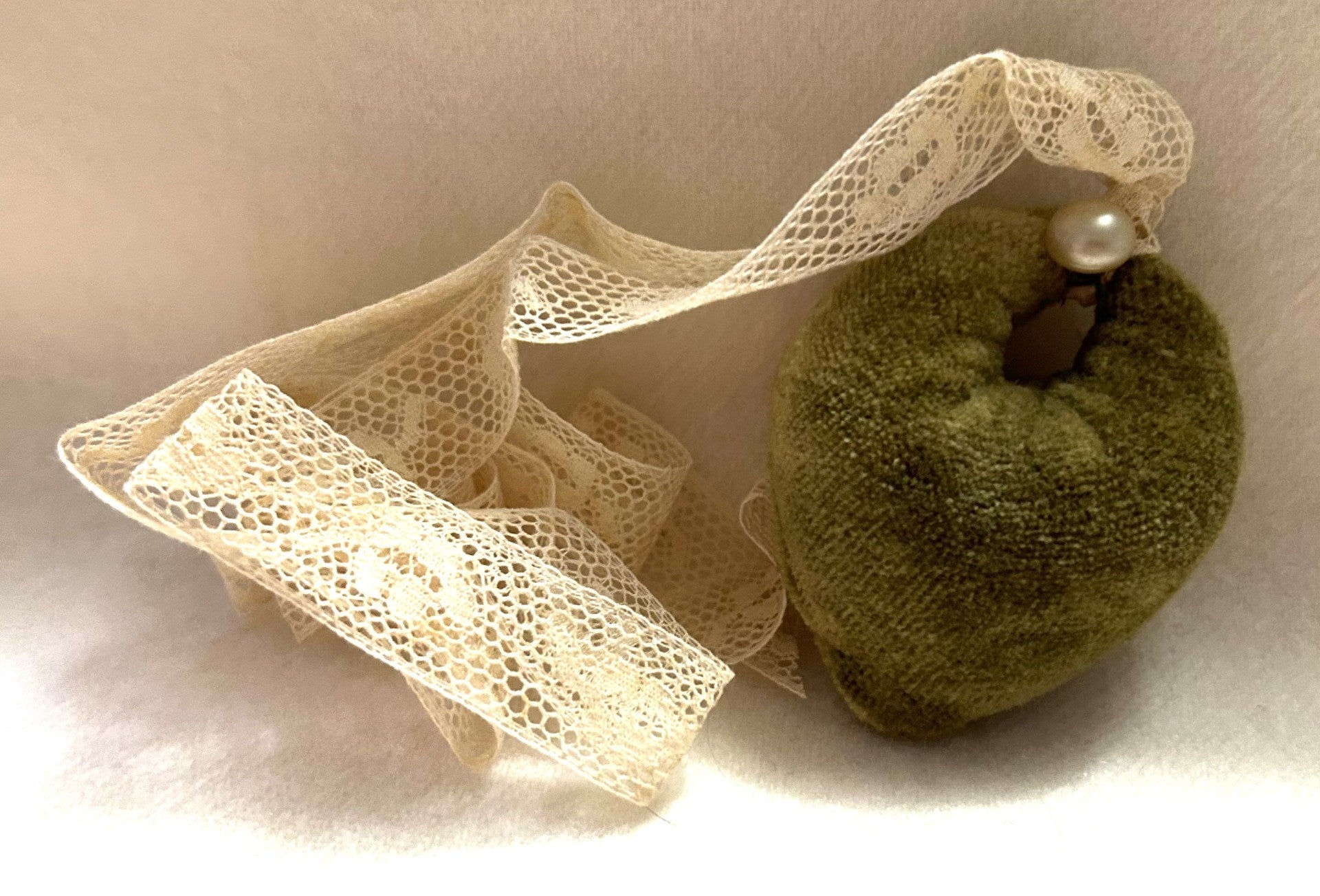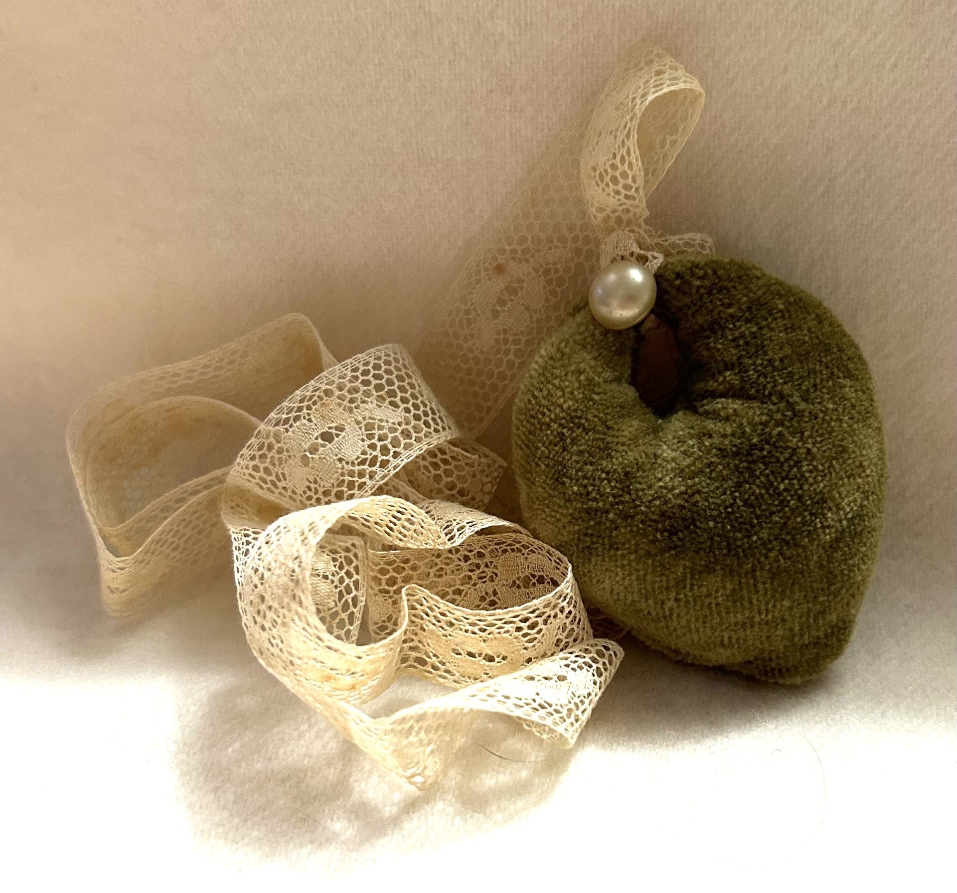 Made using our Fiddlestix Designs' Hand-dyed Velvet. I have added a length of vintage lace ribbon, so you can wear your pincushion around your neck, should you choose to do so. Front and center, I have attached an antique pearl button.