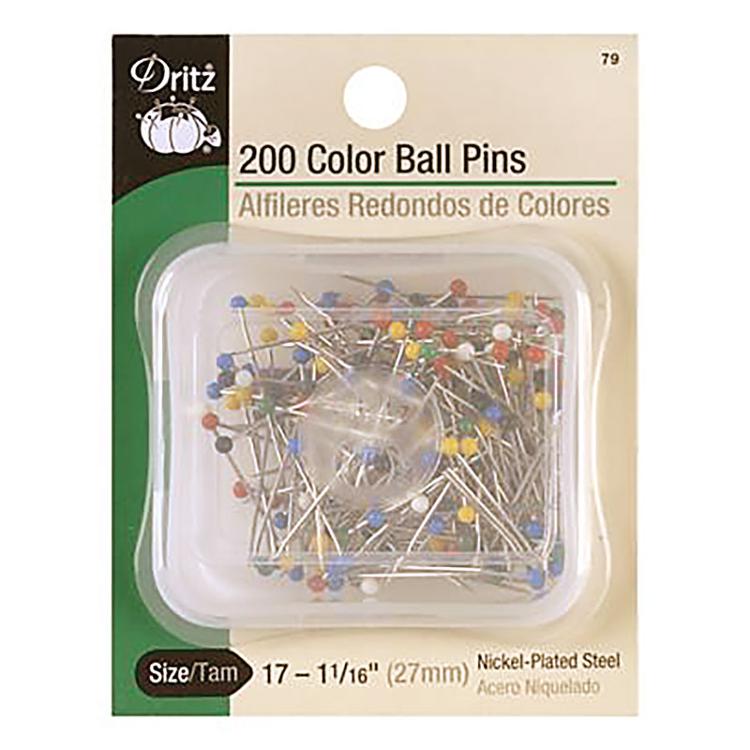 General purpose sewing pins. For medium weight fabrics. Nickel-plated, with plastic storage case. Color Ball Pins 1 1/16 Inch 200 Count