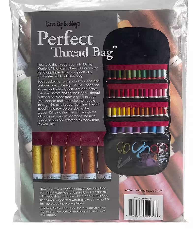 Truly the Perfect Bag for holding your Mettler, YLI and small Aurifil threads and any other spools of a similar size for hand applique. Has 4 zippered pockets for thread and one larger pocket for sewing notions.