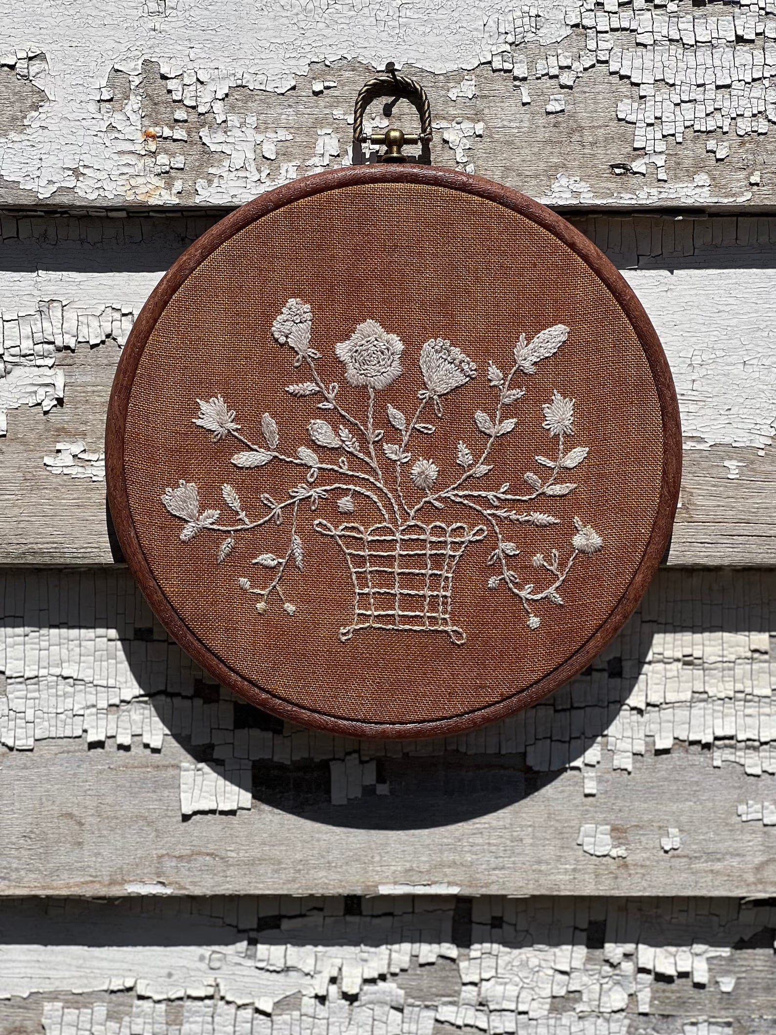"May Basket Antique" is reminiscent of early school-girl embroideries when young ladies were taught basic needlework skills.