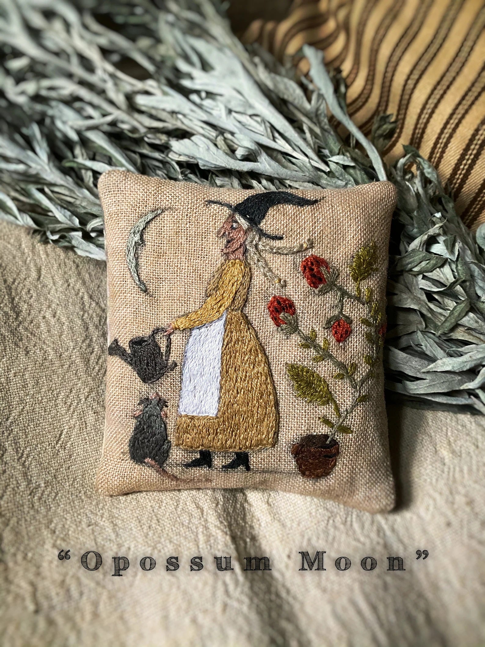 One can only imagine the conversation going between the Opossum, the Moon & the Witch! Model was embroidered with simple stitches, and all DMC floss used throughout.