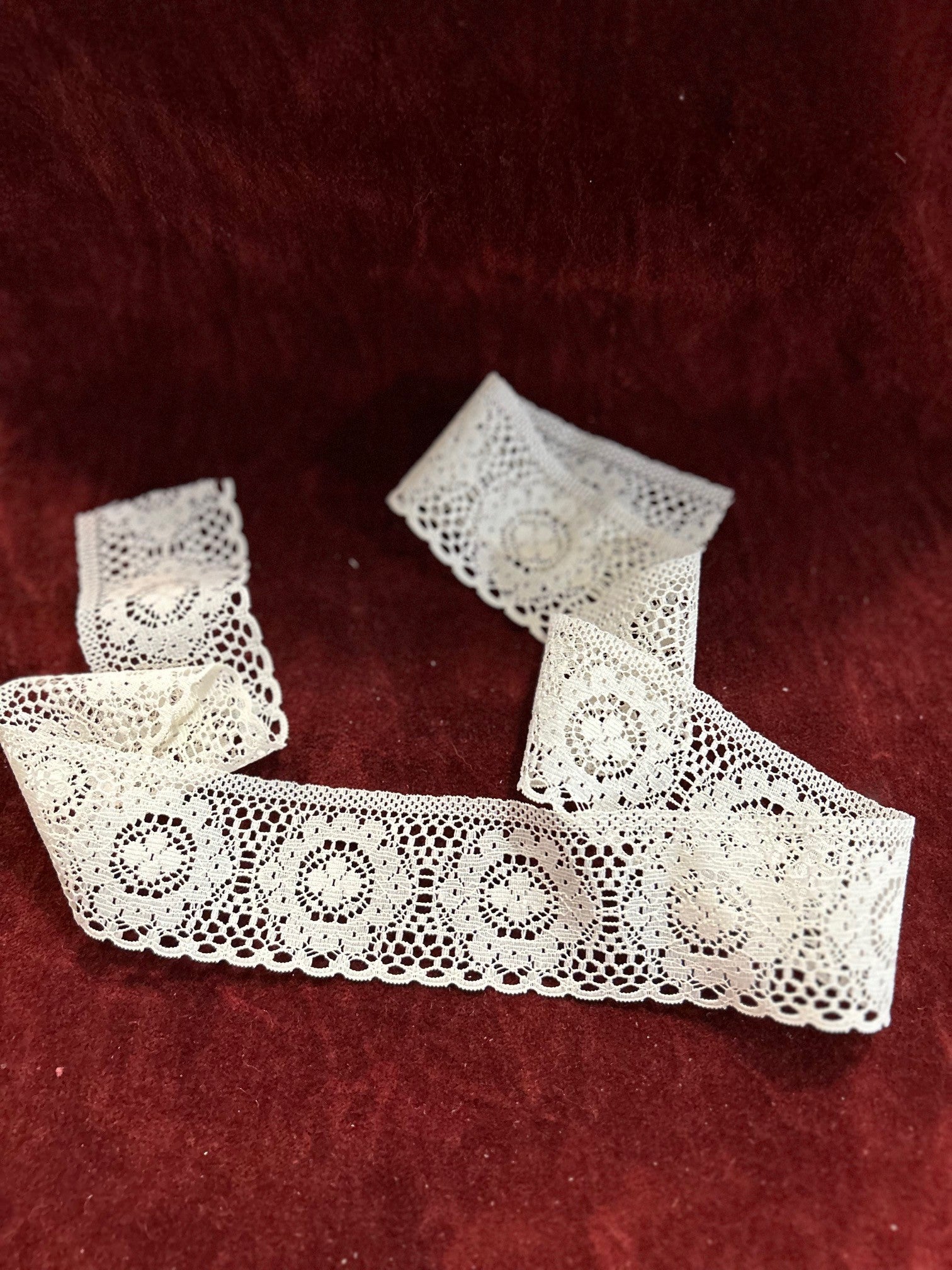 Vintage 70's - Floral motif down the center of the lace. One straight edge, one scalloped edge.