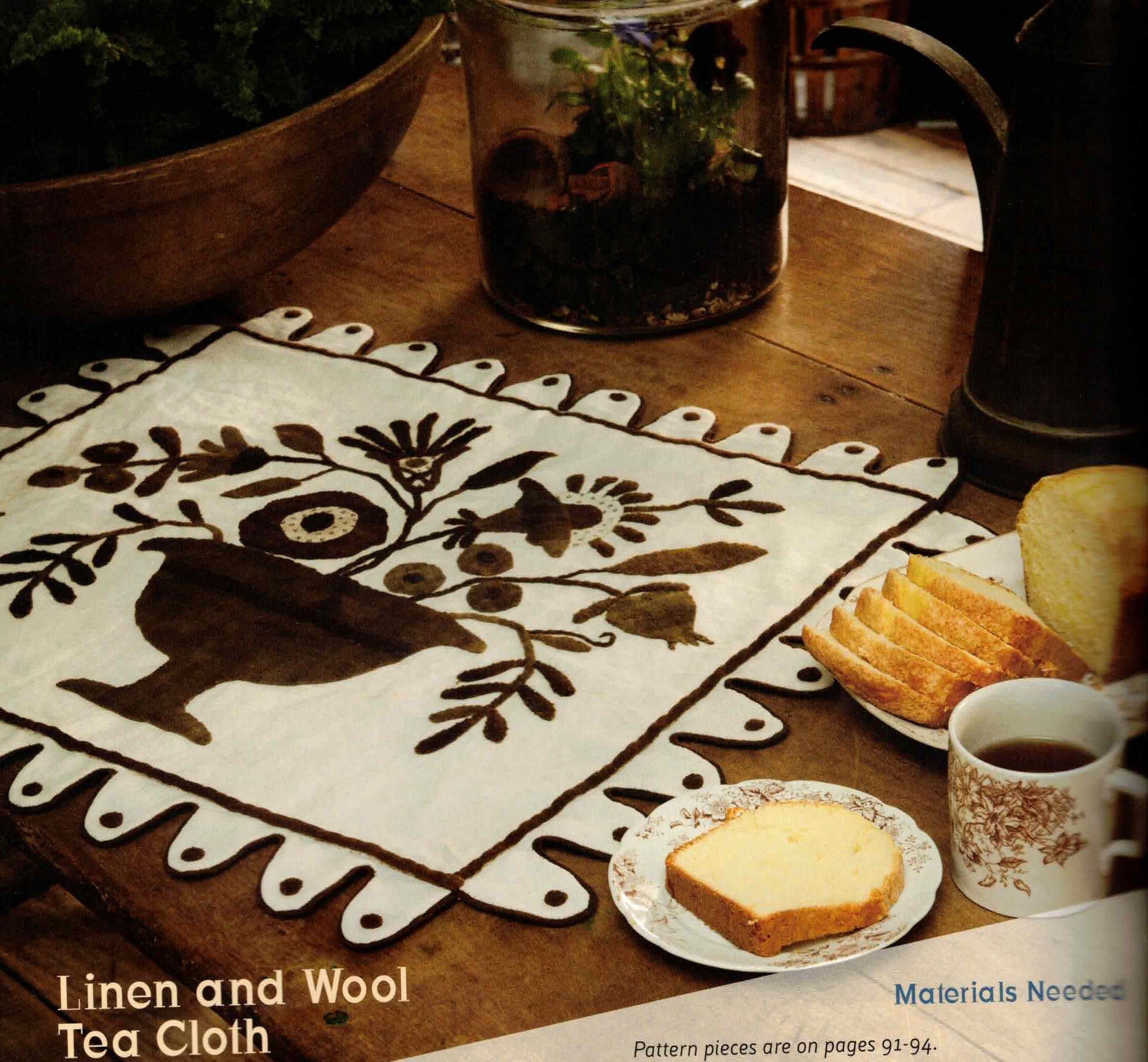 This listing is for the HAND-DYED WOOL KIT/CURRENT COTTON FABRIC ONLY, for the Hand-dyed Wool Applique' Tea Cloth. NOTE: Maggie chose to do her Tea Cloth in Linen and Wool. We chose to do a full hand-dyed wool kit in lieu of the linen, and have used mixed cottons in the applique' as well as wool. You will need to make the necessary adjustments needed when creating your Tea Cloth.