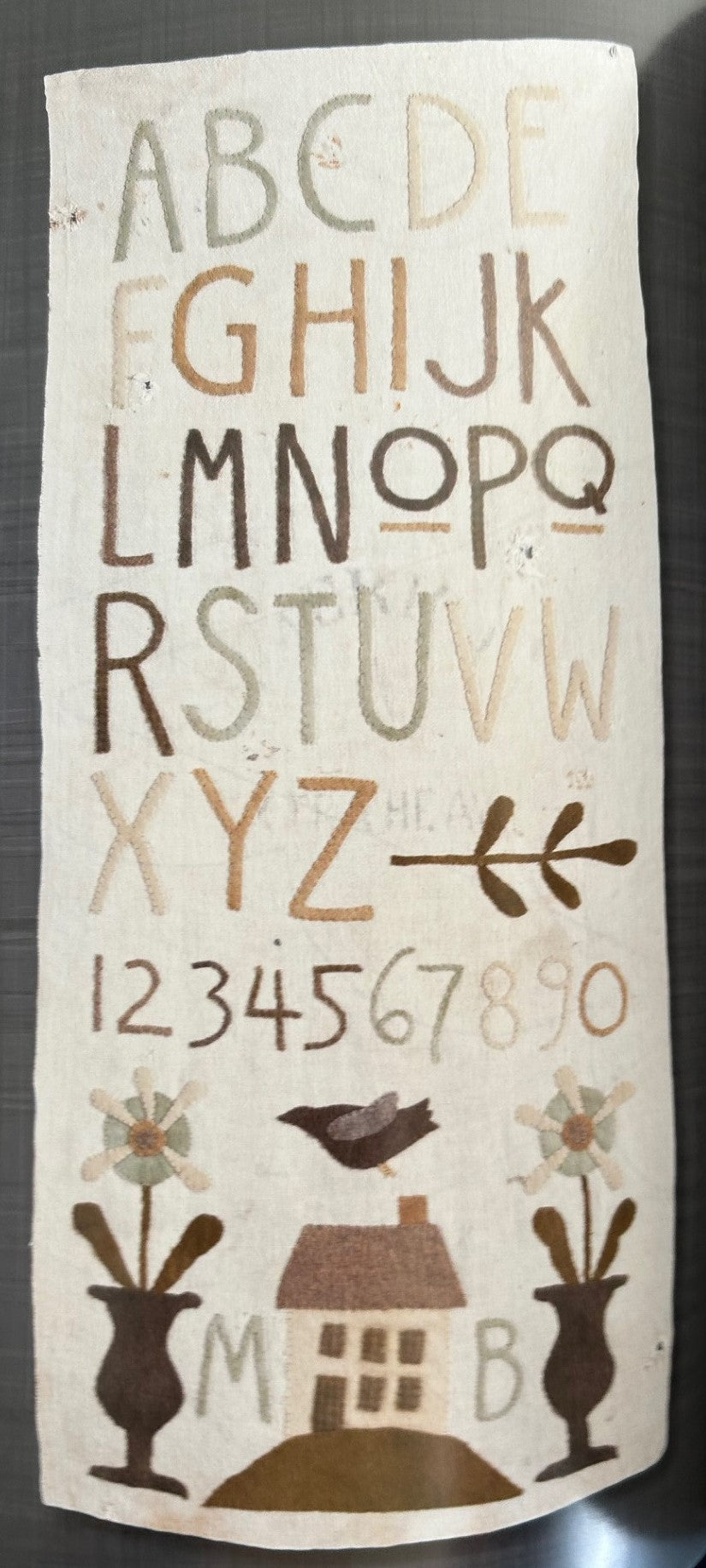 We use Blackberry Primitives Hand-dyed Wool in this kit. This is a lovely piece with an off white background and soft tones of blue, tans, browns and greens for the applique'. One of my favorite Maggie designs. A nice sized piece at 19" x 42". Looks great hung on the wall or on a table...a very versatile piece.