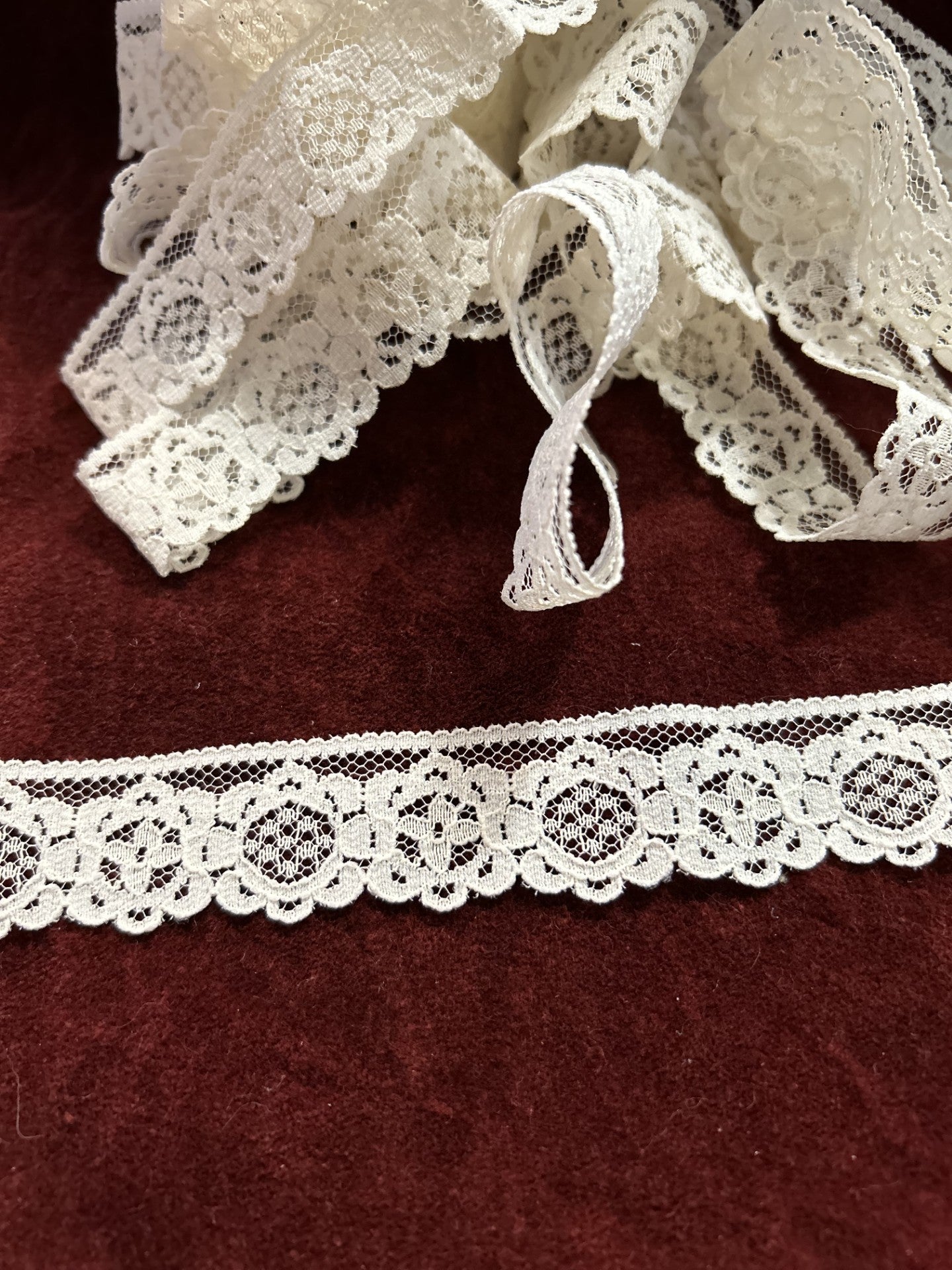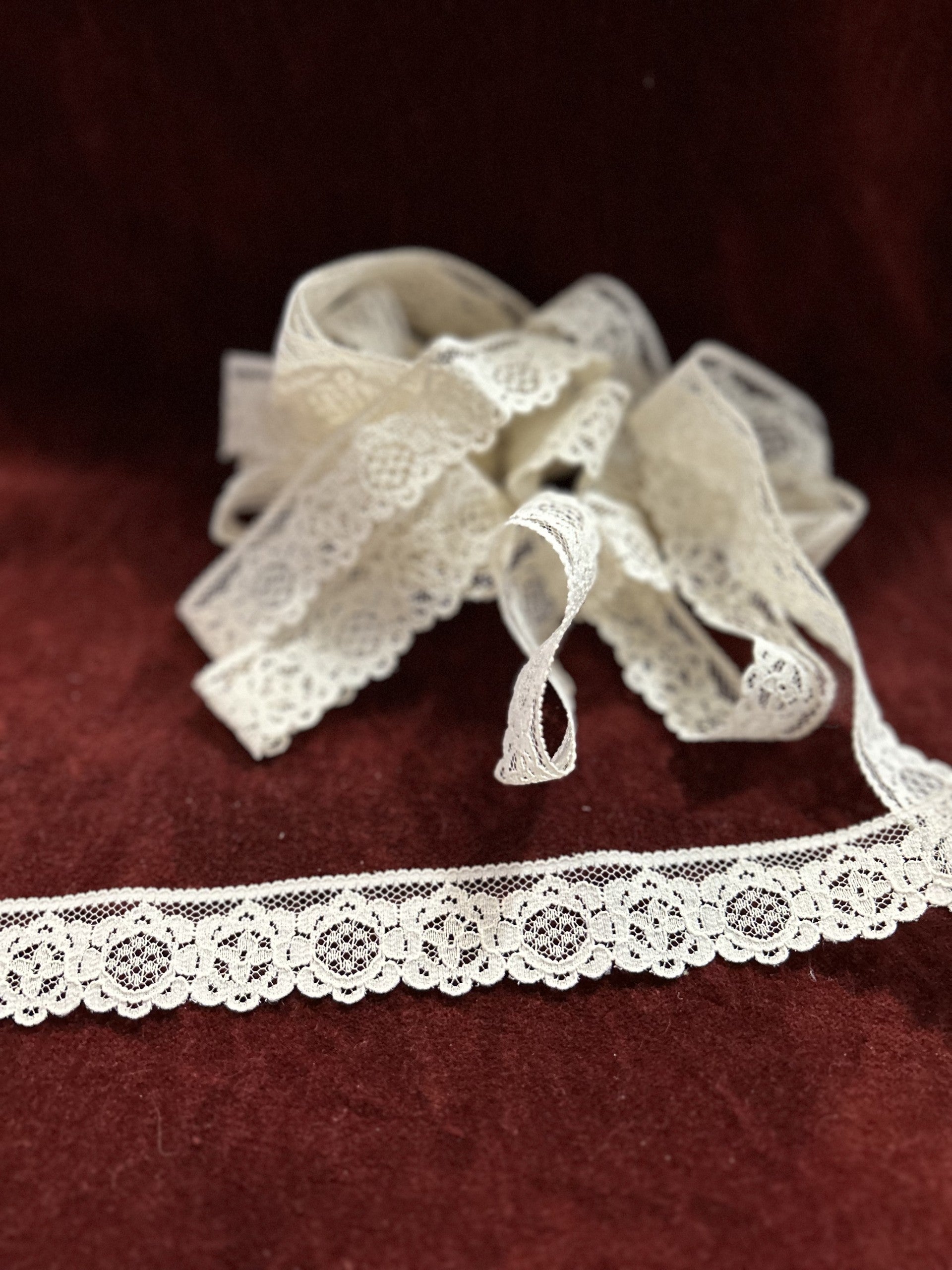 Vintage 80's - One edge has a decorative straight edge, the other edge is scalloped. This trim matches SKU A17, with the exception that SKU A17 has one unfinished edge and one scalloped. This Trim has a Floral motif.