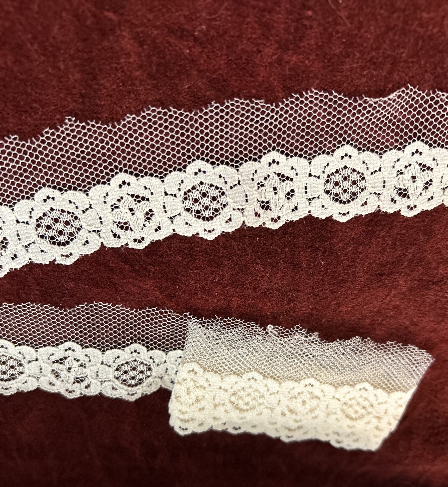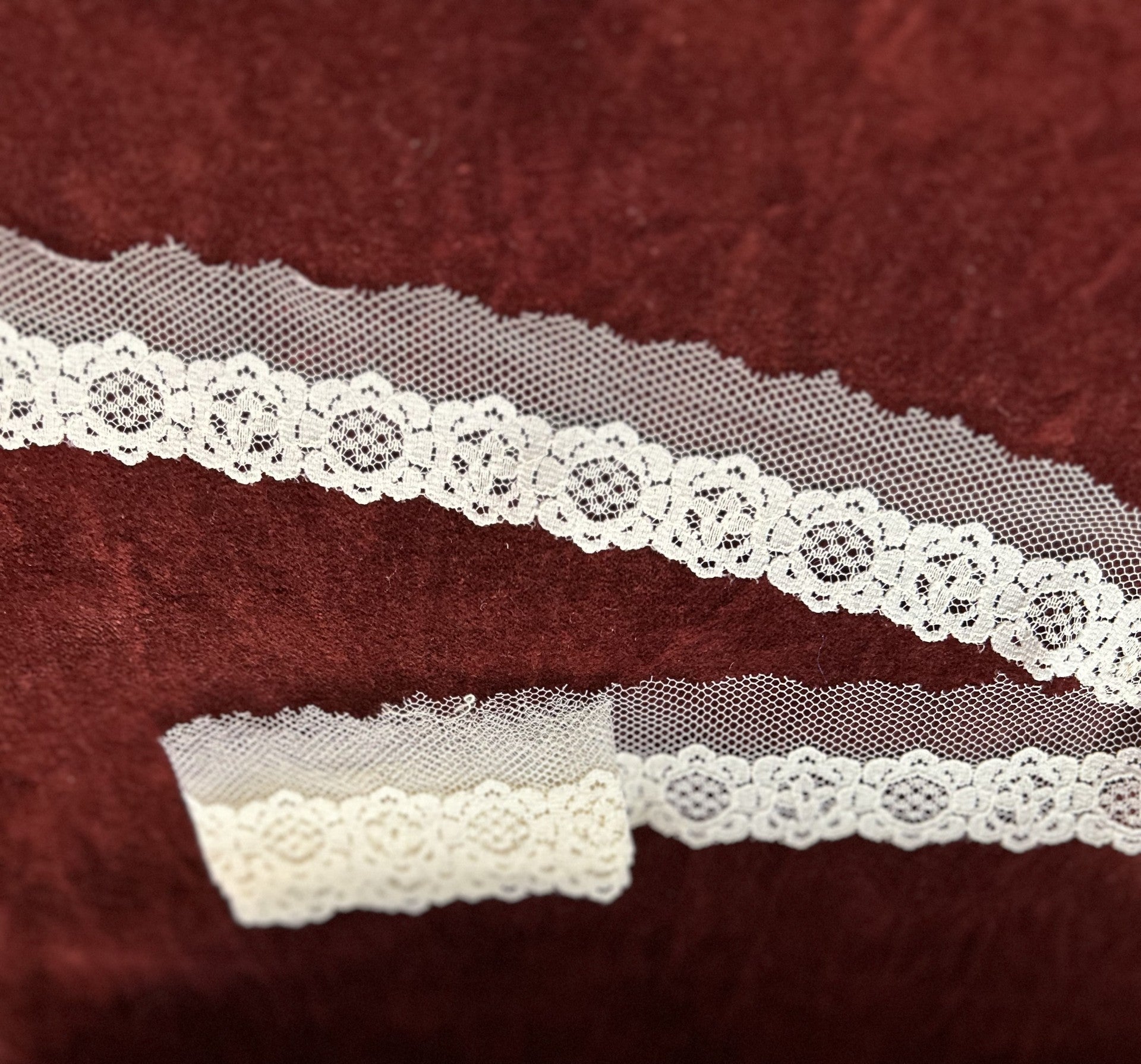 Vintage 80's - Match to SKU A16, with the exception of the top edge being raw netting (unfinished), and the opposite edge scalloped.  Floral motif.