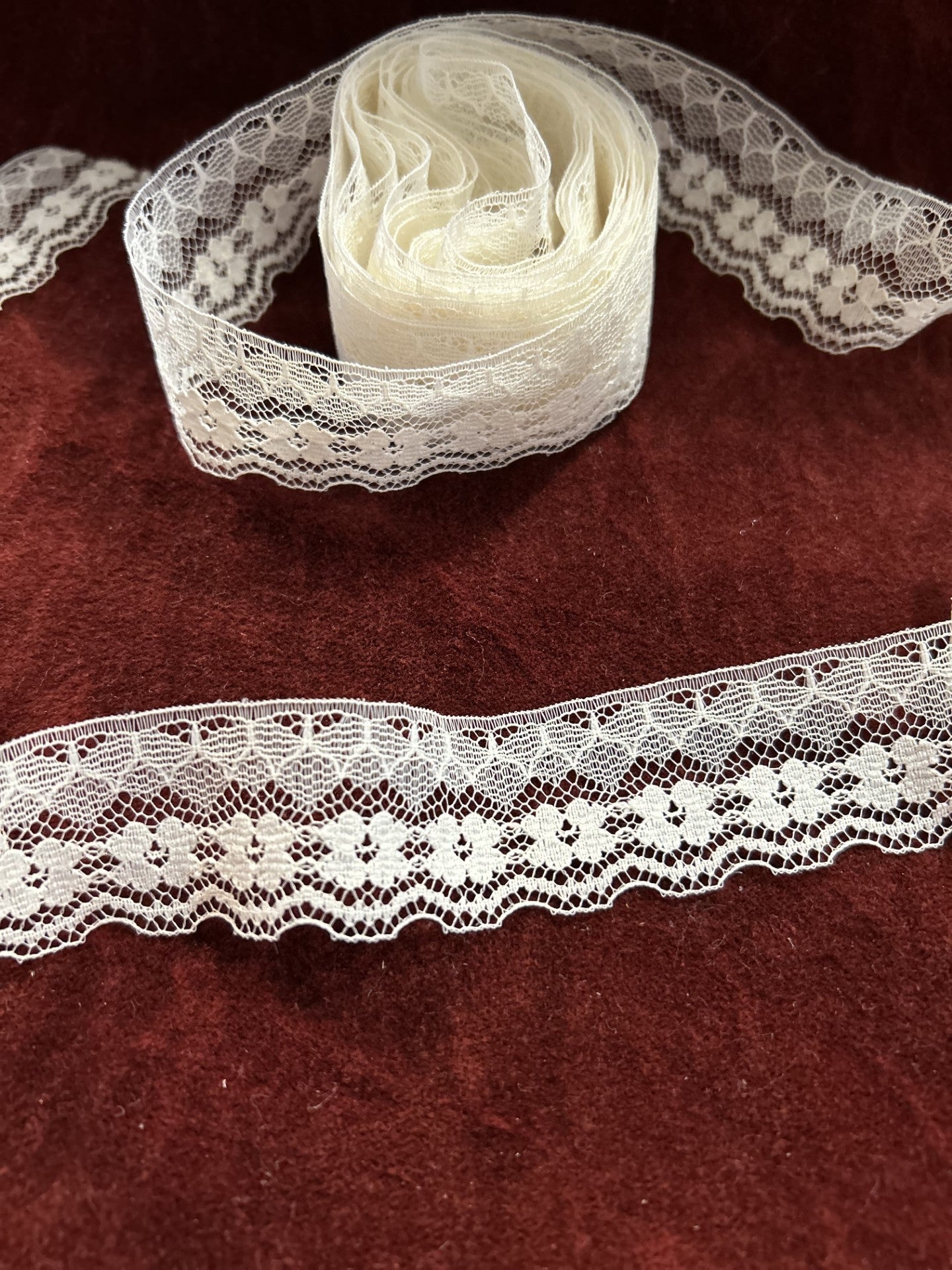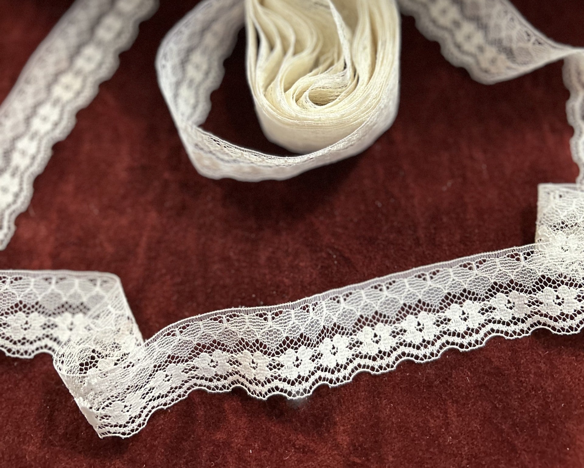 Vintage 70's - One straight edge, one scalloped. A very fine, light lace. Floral (along bottom edge) and almost a butterfly look motif (along top edge).