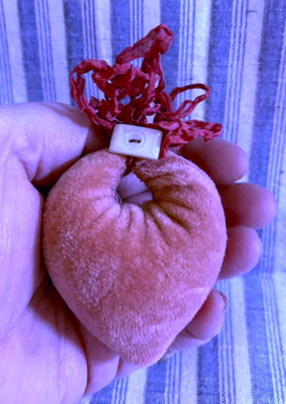 Made using our Fiddlestix Designs' Hand-dyed Velvet. At the top, I have fashions a little hand-dyed, crinkled silk ribbon bobble, along with an antique mother of pearl button.