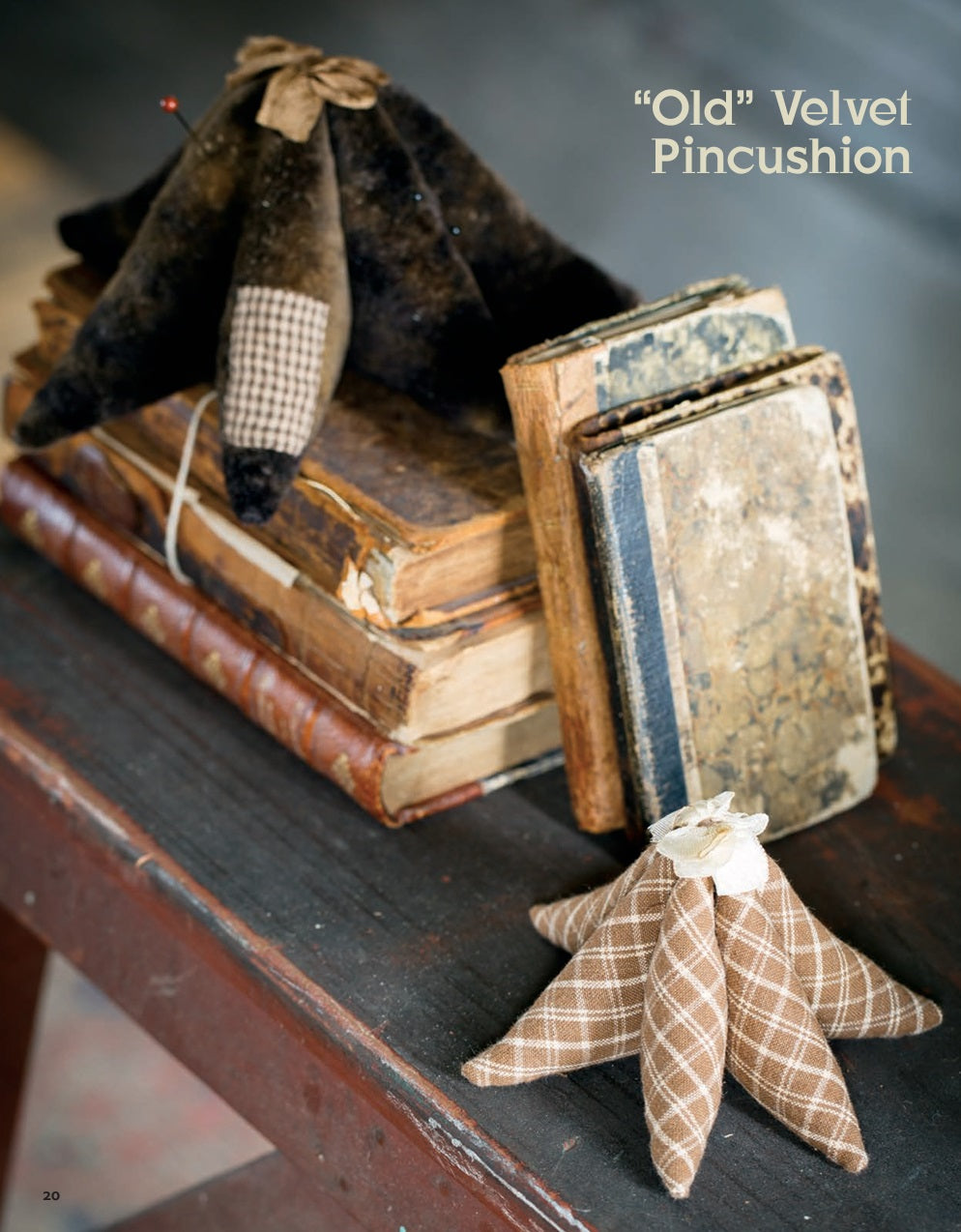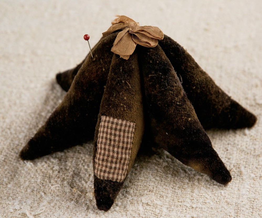 We use Fiddlestix Designs' Hand-dyed Velvet in this kit. You will receive enough velvet to complete the project, as well as a patch of antique fabric and hand-dyed ribbon for the bow on top. Book also has a smaller pincushion pattern included, that is the same style as this pincushion, but smaller. It is shown in the second photograph. Kit is not included, however.