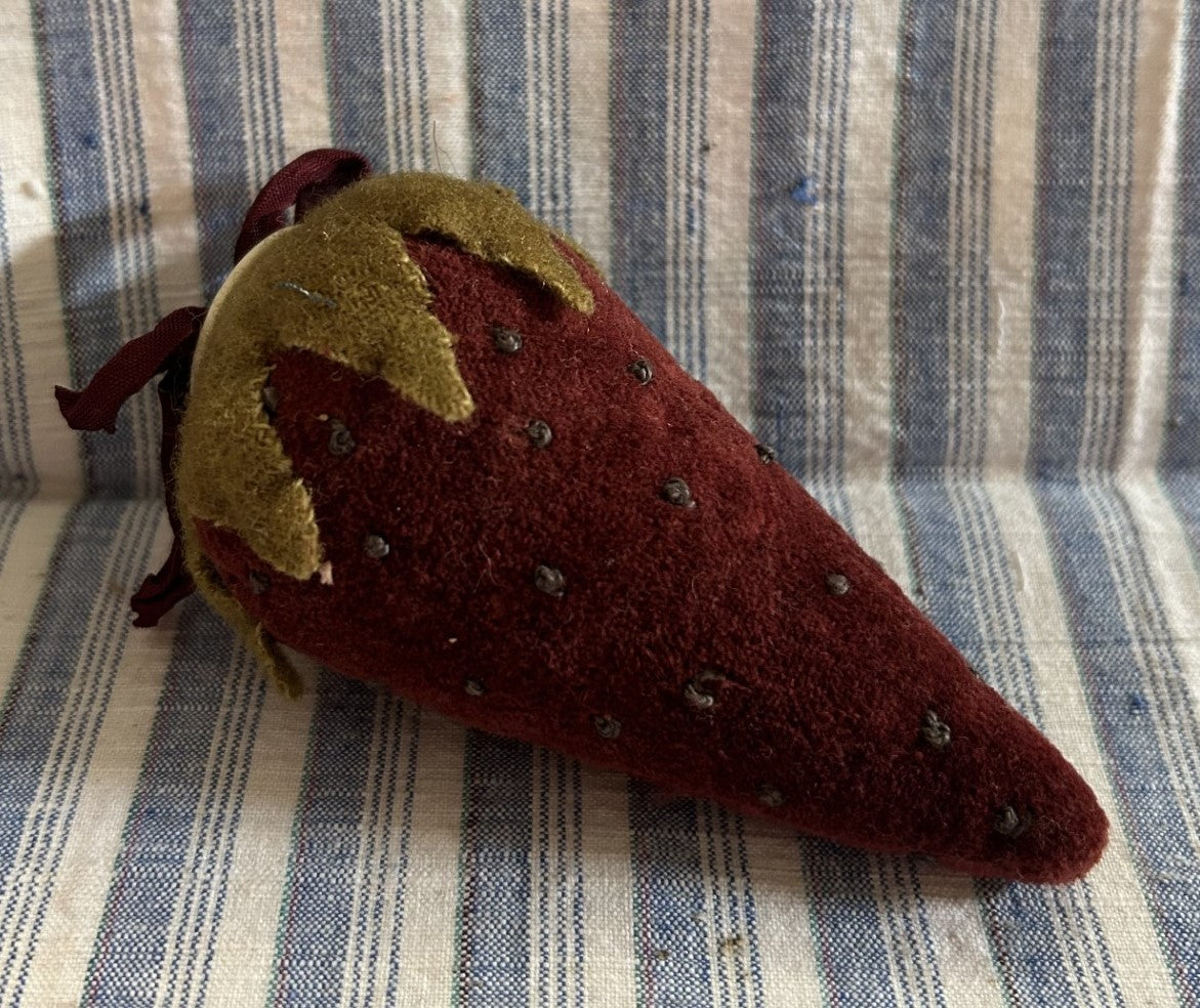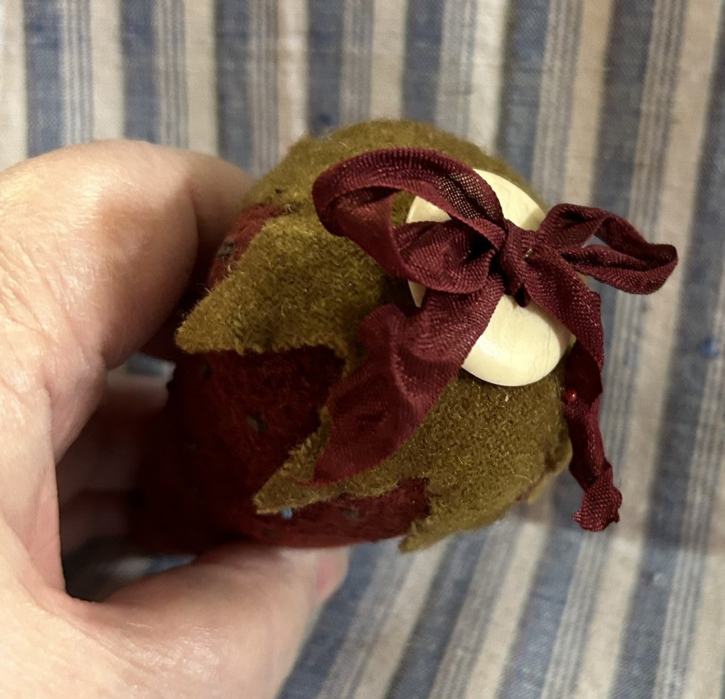This Strawberry Pin Keep fits perfectly in the palm of your hand! Made with our Pomegranate Hand-dyed velvet, it is a deep red color, embellished with an antique bone button and hand-dyed crinkled Pomegranate ribbon. French knots mimic Strawberry Seeds.