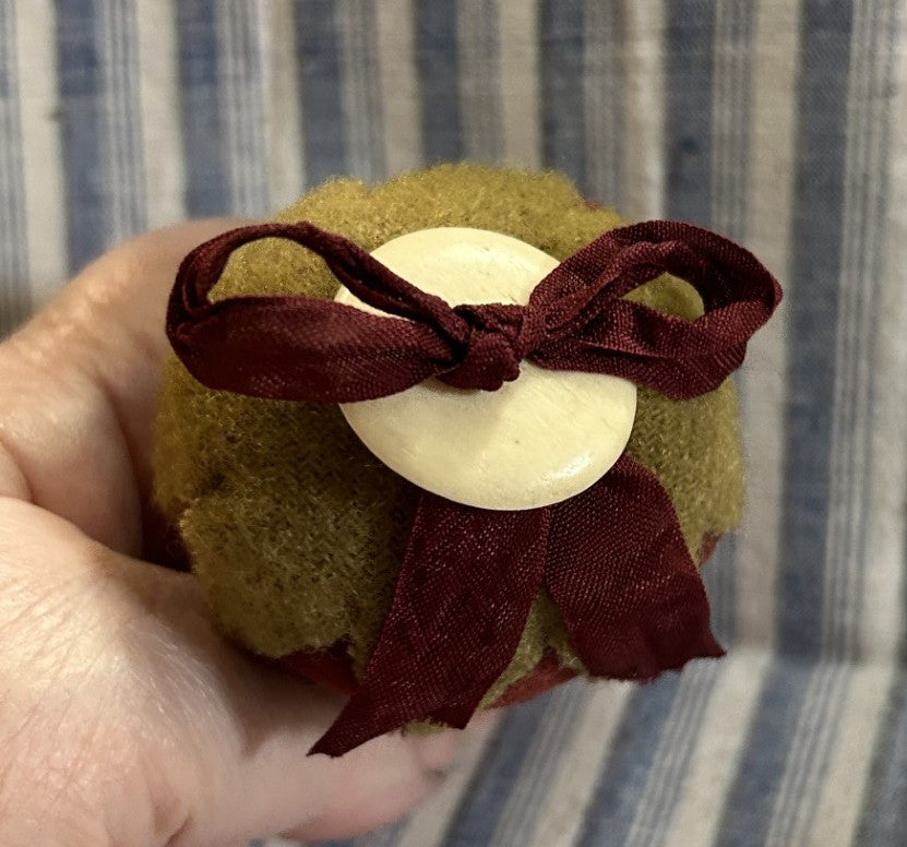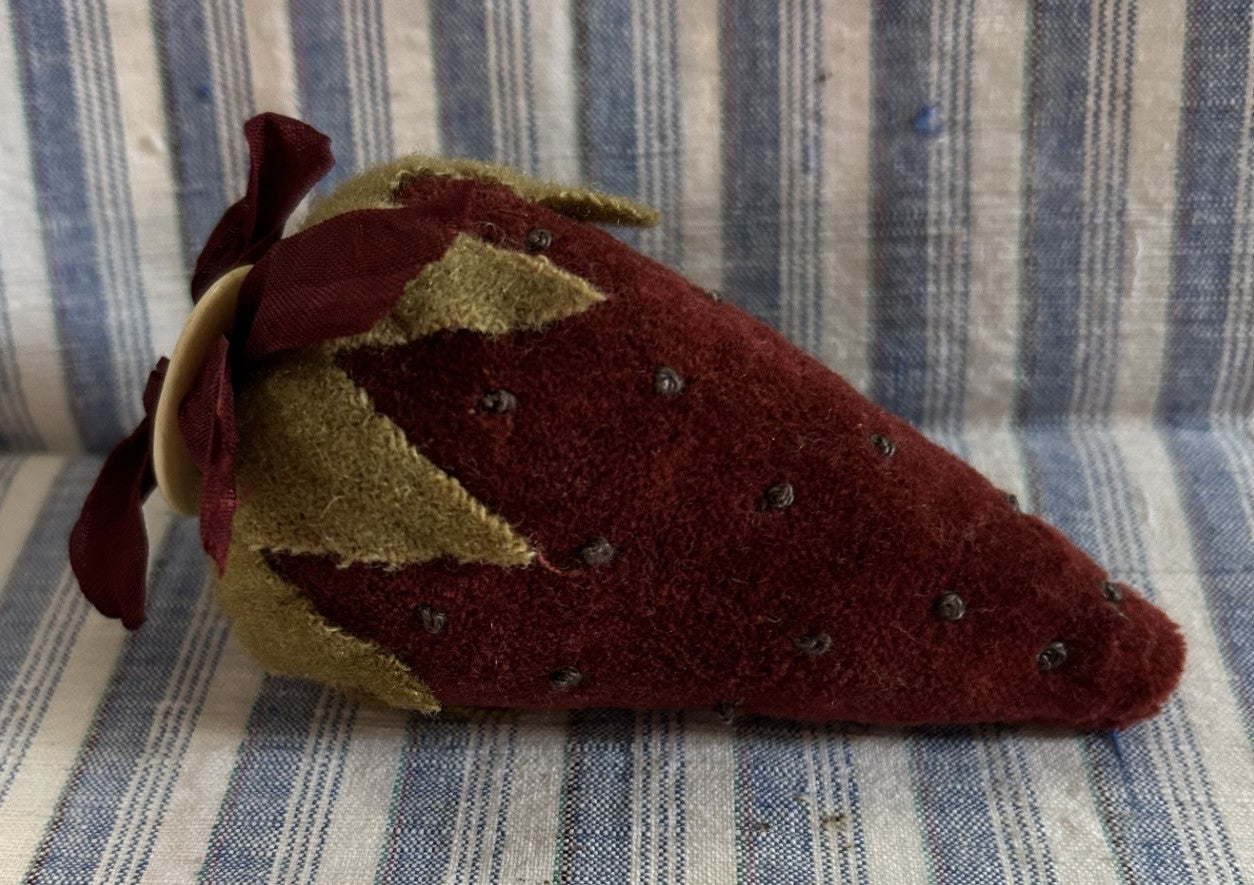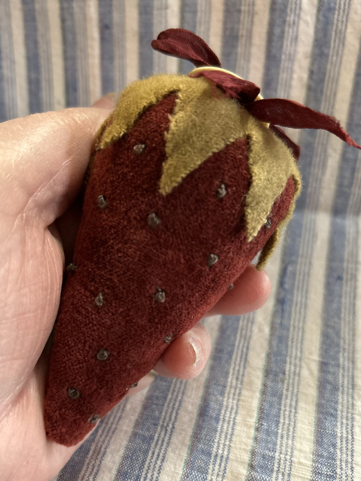 This Strawberry Pin Keep fits perfectly in the palm of your hand! Made with our Pomegranate Hand-dyed velvet, it is a deep red color, embellished with an antique bone button and hand-dyed crinkled Pomegranate ribbon. French knots mimic Strawberry Seeds.
